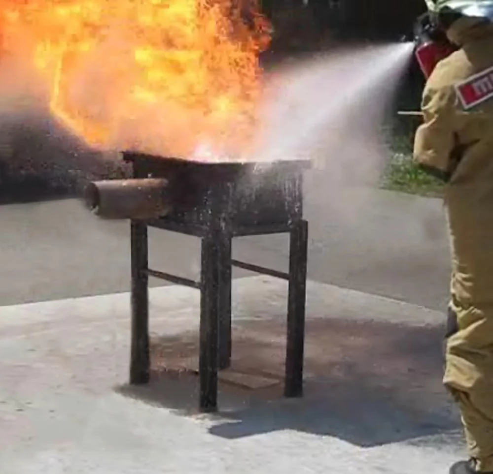 Ein Feuerlöscher mit dem Wert 55A ist also in der Lage, in einer vorgeschriebenen Zeit solch einen brennenden Holzstapel von 5,5 m Breite abzulöschen.