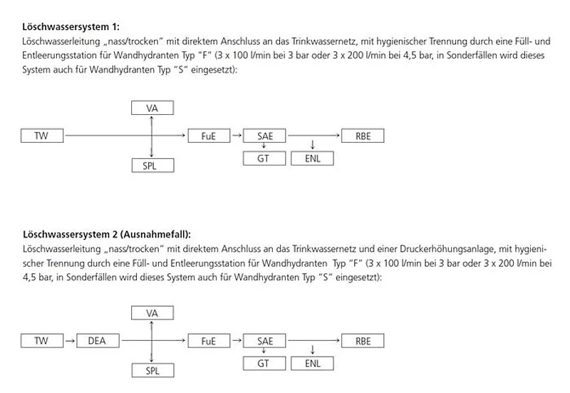 Löschwasserleitung „nass/trocken” mit direktem Anschluss an das Trinkwassernetz, mit hygienischer Trennung durch eine Füll- und Entleerungsstation für Wandhydranten Typ “F“ (3 x 100 l/min bei 3 bar oder 3 x 200 l/min bei 4,5 bar, in Sonderfällen wird dieses System auch für Wandhydranten Typ “S“ eingesetzt): (siehe Abb. 1)