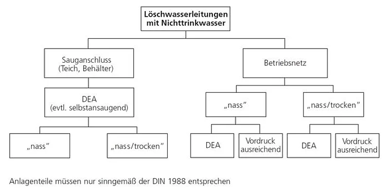 Die vorstehend beschriebenen Löschwassersysteme 1– 6 sind alle an eine Trinkwasserversorgung angeschlossen. Es ist ebenso möglich, diese Löschwassersysteme an eine Nichttrinkwasserversorgung (Brauchwasser) anzuschließen. Alle Anlagenteile müssen dann nur sinngemäß der DIN 1988 entsprechen. Bei Bestands-Löschwassersystemen mit einer erforderlich werdenden Nachrüstung einer hygienischen Trennung, können bei Platzproblemen, in Ausnahmefällen unter Rücksprache mit der Feuerwehr und den Wasserwerken auch ingenieurmäßige Lösungen zum Einbau kommen.