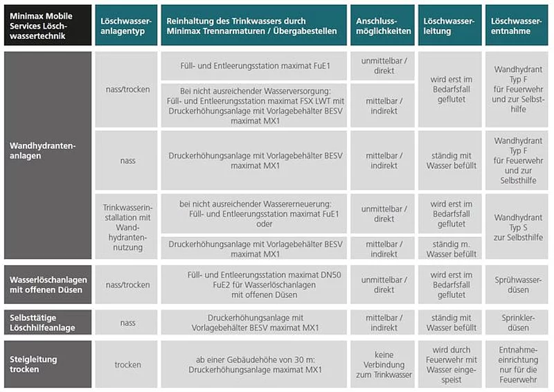 Die Tatsache, dass Trinkwasser ein Lebensmittel ist, stellt hohe spezifische Anforderungen an Planung und Ausführung von Löschwassersystemen. Für die Schnittstelle zwischen Lösch- und Trinkwasser vertreibt Minimax Mobile Services eine Technologie, die zuverlässigen Brandschutz mit der Sicherung der Trinkwasserhygiene kombiniert.