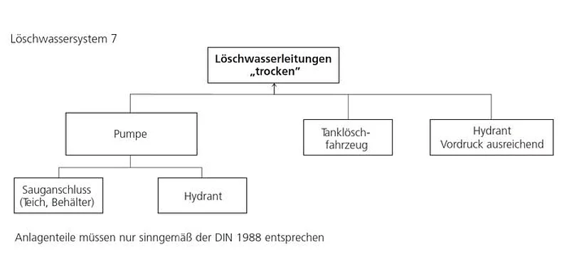 Diese Anlage wird dort eingesetzt, wo die Feuerwehr eine nur für sie bestimmte festinstallierte Löschwasserleitung benötigt. Diese Anlage dient nicht zur Selbsthilfe, sondern ermöglicht der Feuerwehr die Einspeisung und Entnahme von Löschwasser. Liegen Entnahmestellen mehr als 30 m über der Stellfläche für die einspeisende Feuerwehr, so ist eine Druckerhöhungsanlage erforderlich, sofern es im Baurecht nicht anders geregelt ist. (siehe Abb. 4)
