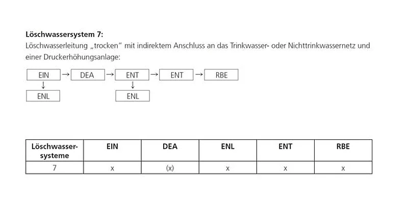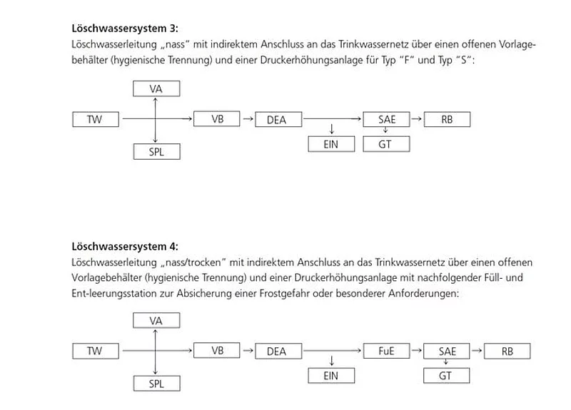Der Aufbau der gesamten Löschwasserleitung bei den oben gezeigten Systemen bedingt einen mindestens 3-fachen Trinkwasservolumenwechsel pro Woche im Rohrnetz. Wenn diese Voraussetzung nicht gegeben ist, so ist ein indirekter Anschluss vorzusehen, wie in den folgenden Systemen gezeigt.